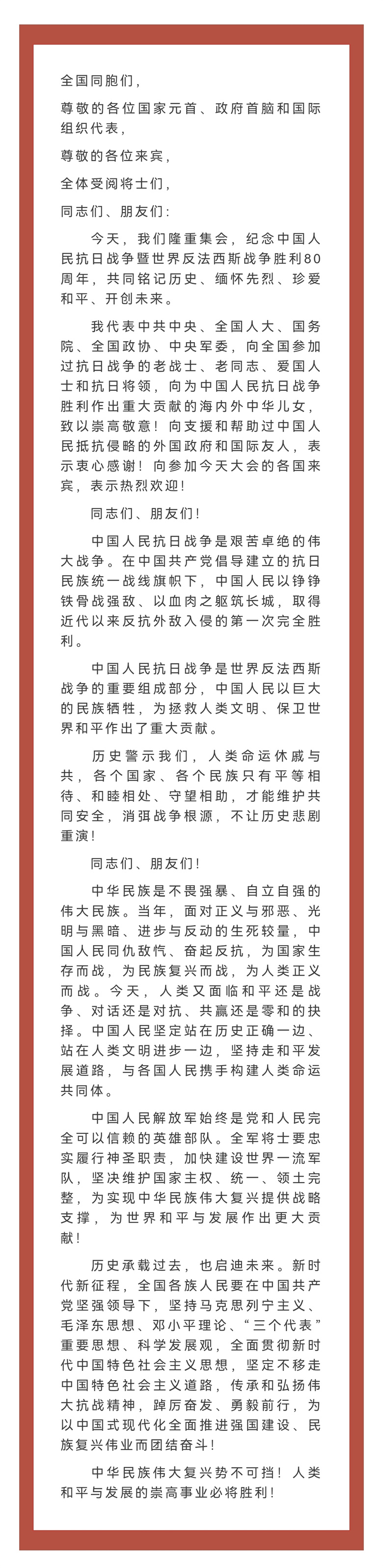 習近平:在紀念中國人民抗日戰爭暨世界反法西斯戰爭勝利80周年大會上的講話